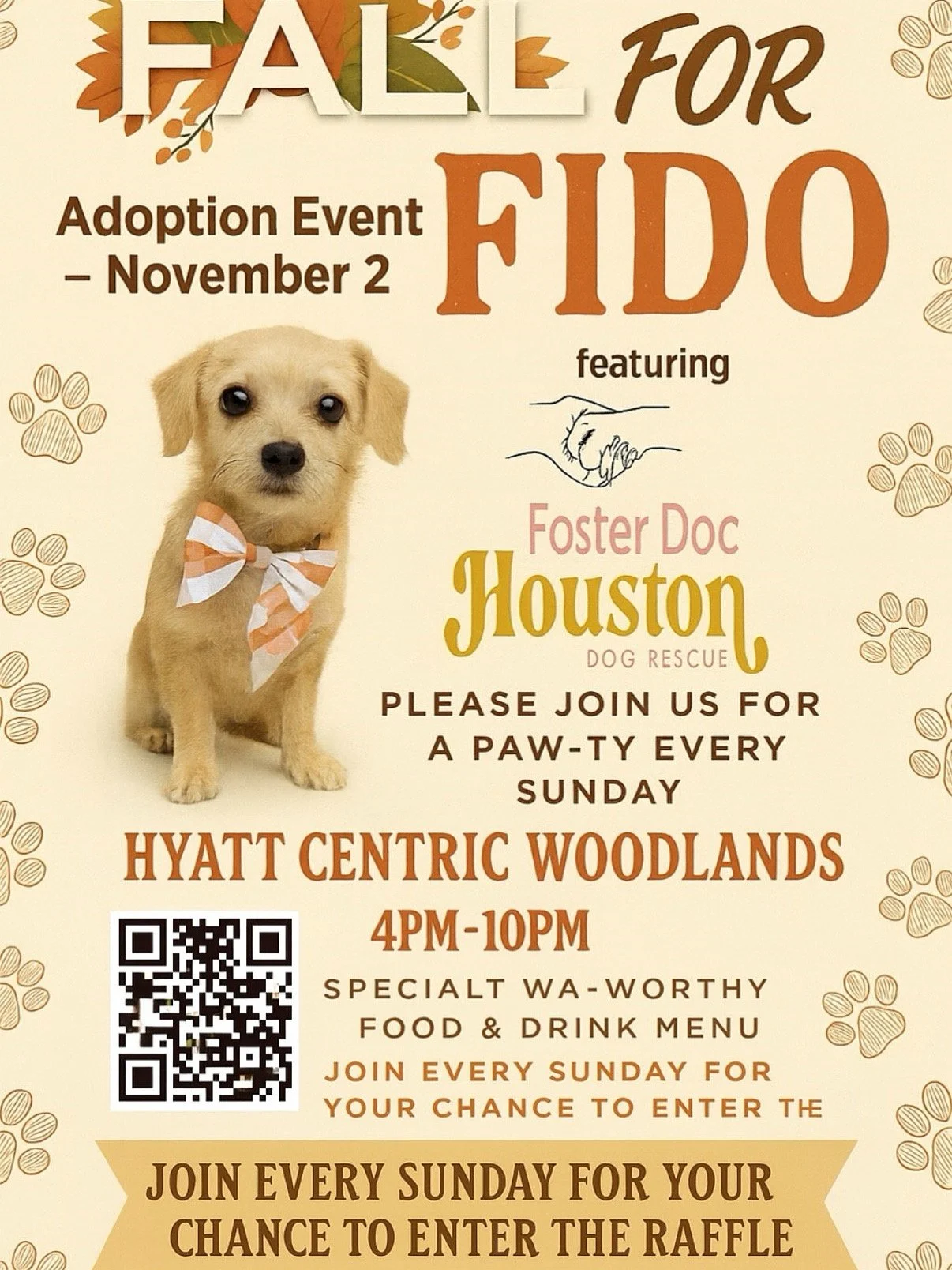 We are honored to be part of this year’s Fall For Fido presented by Hyatt Centric of The Woodlands. On November 2nd from 4:00pm-10:00pm, FosterDoc Houston will present with adoptable dogs on site for paw-ty on the patio!